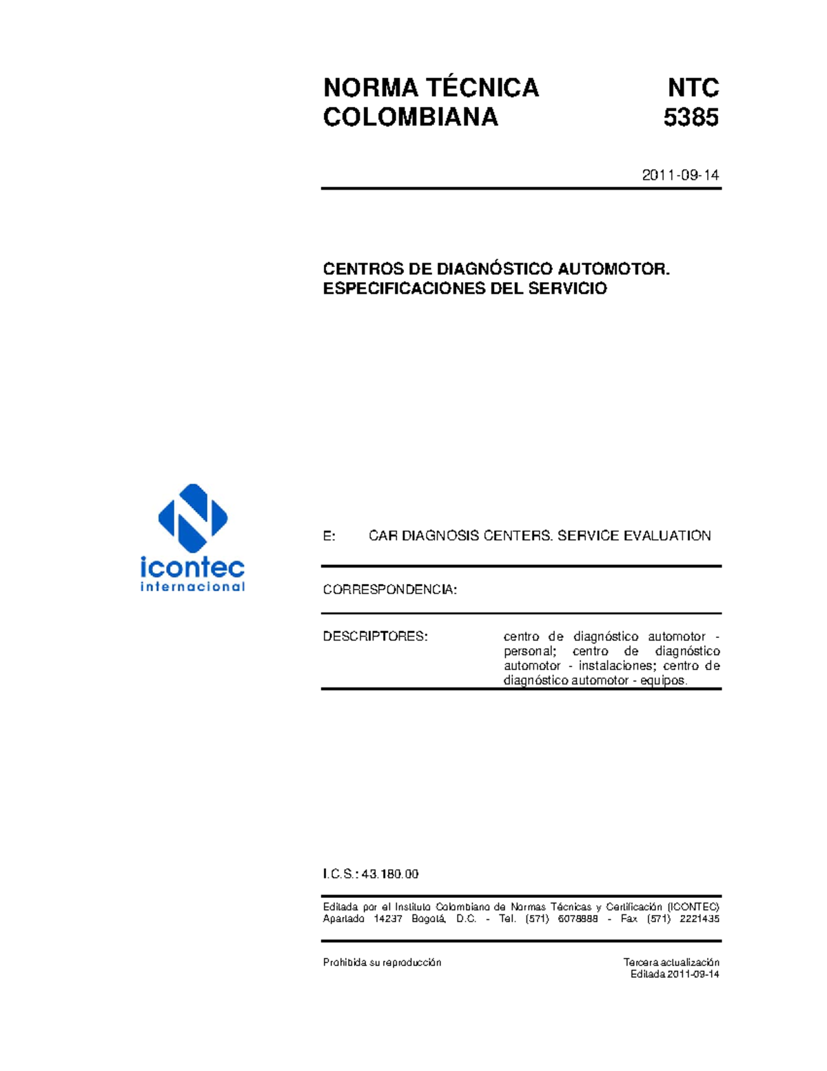 DE DIAGNOSTICO AUTOMOTOR ESPECIFICACIONES DEL SERVICIO ESTA NORMA ESTABLECE LAS ESPECIFICACIONES PARA LA PRESTACIÓN DEL SERVICIO QUE DEBEN CUMPLIR LOS CENTROS DE DIAGNÓSTICO AUTOMOTOR PARA REALIZAR LA REVISIÓN TÉCNICO MECÁNICA Y DE EMISIONES CONTAMINANTES DE LOS VEHÍCULOS AUTOMOTORES